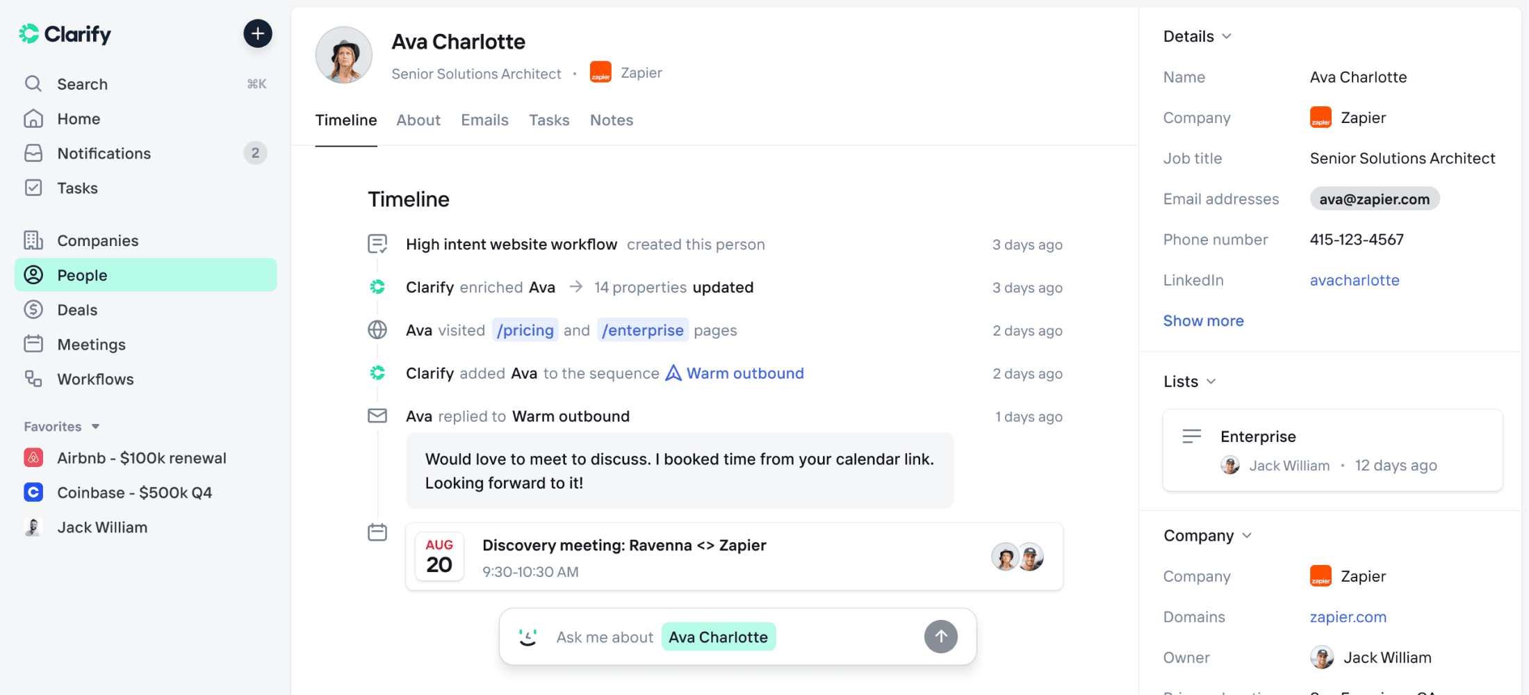 Clarify’s unique pricing model flips the script (free CRM, pay only when the AI agent works for you): Usage-based, not seat-based! This encourages org-wide customer data access and usage.