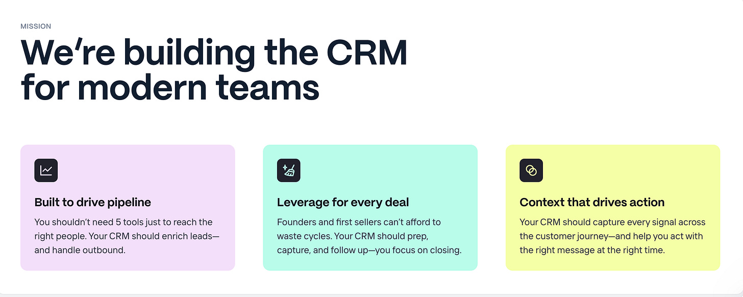 Sabrina: I’d say most startups would be very intimidated to go after the $100 billion dollars plus market of CRM. There’s a lot of incumbents in the space, Salesforce, Hubspot, a bunch of new startup players. Why do you think there’s a specific why now behind building the company and going after this huge antiquated industry?